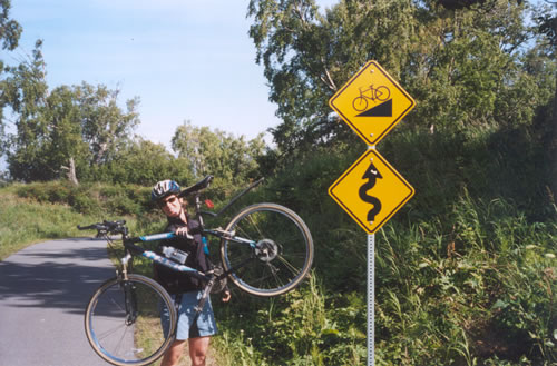 When we got to the center of the city, we dropped off a roll of film at the one-hour developer, and then ate lunch at the Bear Tooth Theater Pub. After this we shopped in a couple of the many sports and outfitters stores and ended up at REI where I bought some waterproofing for the tent fly and a great little compressible Thermarest pillow. Jess bought a water bottle cage for a second bottle and a front fender for her bike. Without a fender, she gets thoroughly soaked and caked with grime when it rains.